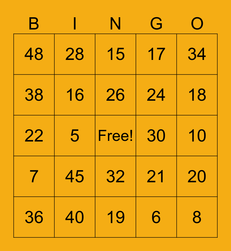 This bingo card has a free space and 24 words: 45, 40, 26, 36, 34, 48, 38, 28, 30, 32, 24, 22, 21, 20, 16, 6, 10, 15, 18, 5, 8, 7, 17 and 19.