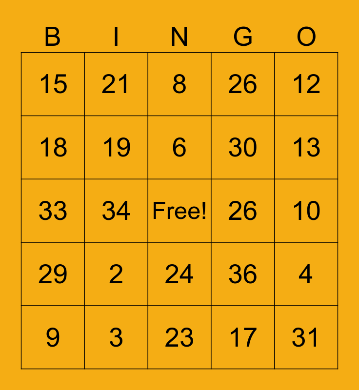This bingo card has a free space and 24 words: 2, 3, 6, 9, 12, 15, 18, 21, 26, 24, 30, 33, 36, 4, 19, 17, 10, 8, 13, 34, 31, 29, 26 and 23.