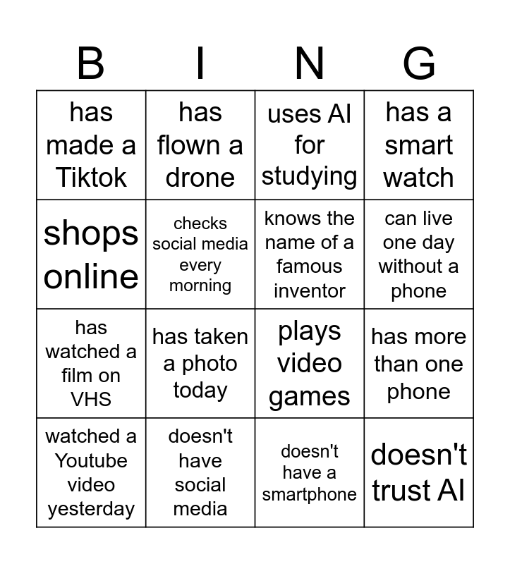 This bingo card has 16 words: doesn't have social media, has more than one phone, uses AI for studying, has made a Tiktok, has watched a film on VHS, has flown a drone, plays video games, doesn't have a smartphone, shops online, checks social media every morning, watched a Youtube video yesterday, has a smart watch, has taken a photo today, can live one day without a phone, knows the name of a famous inventor and doesn't trust AI.