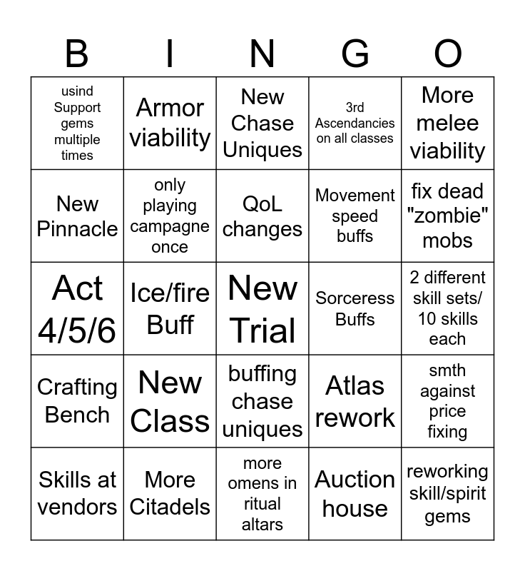 This bingo card has a free space and 24 words: New Class, More Citadels, QoL changes, Skills at vendors, More melee viability, usind Support gems multiple times, New Pinnacle, Armor viability, Sorceress Buffs, buffing chase uniques, Movement speed buffs, Act 4/5/6, Atlas rework, smth against price fixing, only playing campagne once, Auction house, 2 different skill sets/ 10 skills each, New Chase Uniques, fix dead "zombie" mobs, Ice/fire Buff, reworking skill/spirit gems, Crafting Bench, 3rd Ascendancies on all classes and more omens in ritual altars.