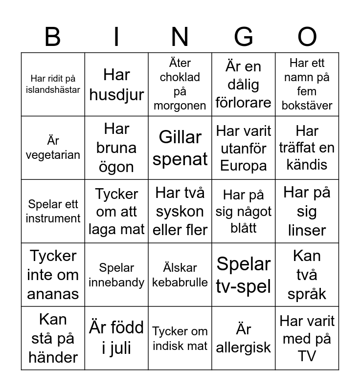 This bingo card has a free space and 24 words: Spelar innebandy, Är född i juli, Gillar spenat, Kan stå på händer, Har ett namn på fem bokstäver, Har ridit på islandshästar, Är vegetarian, Har husdjur, Har på sig något blått, Älskar kebabrulle, Har varit utanför Europa, Spelar ett instrument, Spelar tv-spel, Kan två språk, Har bruna ögon, Är allergisk, Har på sig linser, Äter choklad på morgonen, Har träffat en kändis, Tycker om att laga mat, Har varit med på TV, Tycker inte om ananas, Är en dålig förlorare and Tycker om indisk mat.