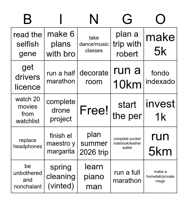 This bingo card has a free space and 24 words: finish el maestro y margarita, spring cleaning (vinted), decorate room, be unbothered and nonchalant, make 5k, read the selfish gene, get drivers licence, make 6 plans with bro, start the per, plan summer 2026 trip, run a 10km, watch 20 movies from watchlist, complete pocket notebook/leather wallet, run 5km, run a half marathon, run a full marathon, invest 1k, take dance/music classes, fondo indexado, complete drone project, make a homelab/private msgs, replace headphones, plan a trip with robert and learn piano man.