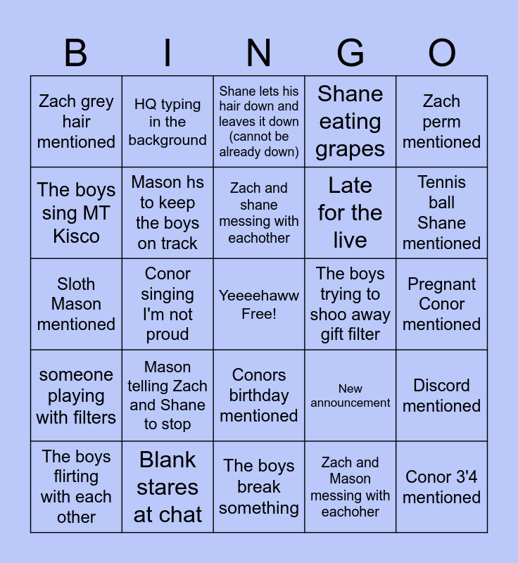 This bingo card has a free space and 34 words: Mason beatboxing/pretending to DJ, Zach and Mason messing with eachoher, Conors long hair mentioned, Mason being sassy, someone playing with filters, Mason hs to keep the boys on track, Zach perm mentioned, The boys flirting with each other, HQ typing in the background, The boys do heart hands, Zach and shane messing with eachother, Shane lets his hair down and leaves it down (cannot be already down), Random singing, Roarrrrrrrr (cause of gift), The boys trying to shoo away gift filter, Tennis ball Shane mentioned, Blank stares at chat, Sloth Mason mentioned, Mason telling Zach and Shane to stop, New announcement, Conors birthday mentioned, Woooooooow, Zach grey hair mentioned, Pregnant Conor mentioned, The boys break something, Conor 3'4 mentioned, Shane eating grapes, The boys have a guest, Late for the live, The boys sing MT Kisco, Maddy mentioned, Conor singing I'm not proud, Discord mentioned and Mason hugs someone.