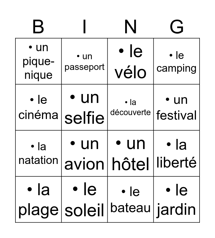 This bingo card has 44 words: Free!, • la plage, • la montagne, • le musée, • la ville, • la campagne, • le vélo, • la randonnée, • le cinéma, • la piscine, • le camping, • le soleil, • un livre, • un château, • un match de foot, • les amis, • la famille, • un hôtel, • un train, • un avion, • un passeport, • un marché, • le shopping, • un pique-nique, • la mer, • le bateau, • la fête, • le concert, • la musique, • le jardin, • le sport, • un barbecue, • un sac à dos, • un portable, • la liberté, • la nourriture, • une glace, • un parc d’attractions, • un festival, • un selfie, • la natation, • une promenade, • la découverte and • les vacances parfaites.