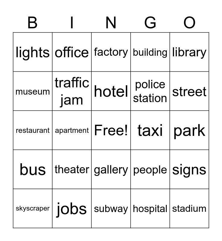 This bingo card has a free space and 26 words: gallery, hospital, hotel, jobs, library, lights, museum, office, park, people, police station, restaurant, signs, skyscraper, apartment, bank, building, bus, factory, stadium, street, subway, taxi, theater, traffic jam and university.