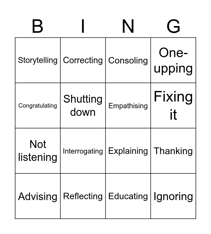 This bingo card has 18 words: Interrogating, Ignoring, Consoling, Storytelling, Explaining, One-upping, Advising, Correcting, Fixing it, Not listening, Educating, Congratulating, Thanking, Shutting down, Empathising, Sympathising, Reflecting and Avoiding.