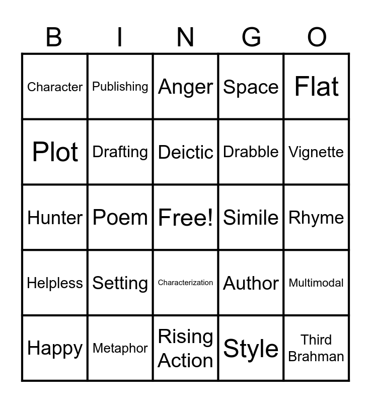 This bingo card has a free space and 59 words: Resolution, Metaphor, Personification, Helpless, Style, Spatial, Drafting, Meter, Drabble, Fable, Space, Short Stories, Plot, Introduction, Panchatantra, Character, Third Brahman, Flat, Static, Deictic, Simile, Anger, Happy, Multimodal, Linguistic, Fourth Brahman, Theme, Point of View, Vignette, Antithesis, Time, Place, Historical, Revising, Publishing, Aural, Spatial, Poem, Lion, Hunter, Round, Setting, Rhyme, Stanza, Afro-Asian, China, India, Antagonist, Characterization, Rising Action, Nature, Society, Technology, Supernatural, Speaker, Author, Brainstorming, Visual and Modes.