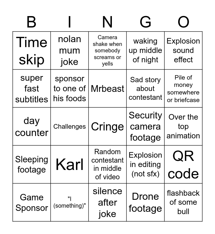 This bingo card has a free space and 24 words: Karl, "I (something)", Mrbeast, Game Sponsor, Explosion sound effect, Time skip, super fast subtitles, nolan mum joke, Security camera footage, Random contestant in middle of video, Sad story about contestant, day counter, Explosion in editing (not sfx), QR code, sponsor to one of his foods, Drone footage, Over the top animation, Camera shake when somebody screams or yells, Pile of money somewhere or briefcase, Challenges, flashback of some bull, Sleeping footage, waking up middle of night and silence after joke.