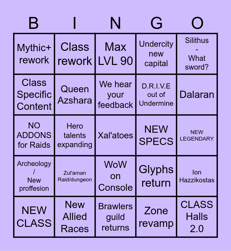 This bingo card has a free space and 24 words: NEW CLASS, Zul'aman Raid/dungeon, We hear your feedback, Zone revamp, Silithus - What sword?, Mythic+ rework, Class rework, Max LVL 90, NEW SPECS, NEW LEGENDARY, NO ADDONS for Raids, Queen Azshara, Glyphs return, Ion Hazzikostas, Class Specific Content, New Allied Races, Brawlers guild returns, Undercity new capital, Dalaran, Archeology / New proffesion, Hero talents expanding, WoW on Console, D.R.I.V.E out of Undermine and CLASS Halls 2.0.
