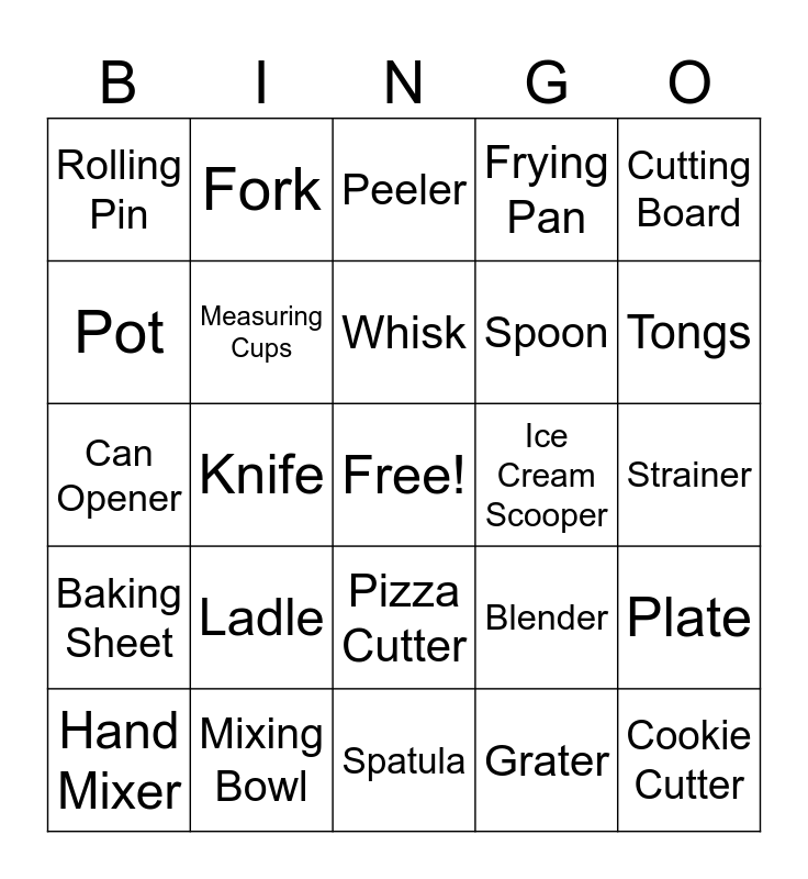 This bingo card has a free space and 24 words: Ladle, Mixing Bowl, Whisk, Hand Mixer, Cutting Board, Rolling Pin, Pot, Fork, Ice Cream Scooper, Pizza Cutter, Spoon, Can Opener, Blender, Plate, Measuring Cups, Grater, Strainer, Peeler, Tongs, Knife, Cookie Cutter, Baking Sheet, Frying Pan and Spatula.