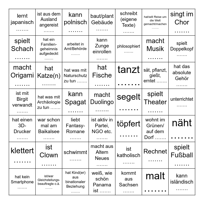This bingo card has 49 words: Rechnet ……., macht Musik ……., kommt aus Sachsen ……., hat was mit Archäologie zu tun ……., hat was mit Naturschutz zu tun ……., unterrichtet ……., ist aus dem Ausland angereist ……., hat Kind(er) aus binationaler Beziehung ……., hat/will Reise um die Welt gemacht/machen ……., ist aktiv in Partei, NGO etc. ……., singt im Chor ……., baut/plant Gebäude ……., sät, pflanzt, gießt, erntet ……., tanzt ……., ist Clown ……., spielt Theater ……., spielt Schach ……., spielt Doppelkopf ……., spielt Fußball ……., schreibt (eigene Texte) ……., philosophiert ……., kann Spagat ……., lernt japanisch ……., hat ein Familien- geheimnis aufgedeckt ……., hat kein Smartphone ……., arbeitet in Amt/Behörde ……., hat das absolute Gehör ……., ist/war Gleichstellungs- beauftragte o.ä. ……., hat Fische ……., hat Katze(n) ……., kann isländisch ……., segelt ……., klettert ……., schwimmt ……., ist mit Birgit verwandt ……., töpfert ……., wohnt im Grünen/ auf dem Dorf ……., näht ……., macht Origami ……., liebt Fantasy-Romane ……., macht aus Altem Neues ……., hat einen 3D-Drucker ……., macht Duolingo ……., weiß, wie schön Panama ist ……., kann Zunge einrollen ……., kann polnisch ……., ist katholisch ……., war schon mal am Baikalsee ……. and malt ……..