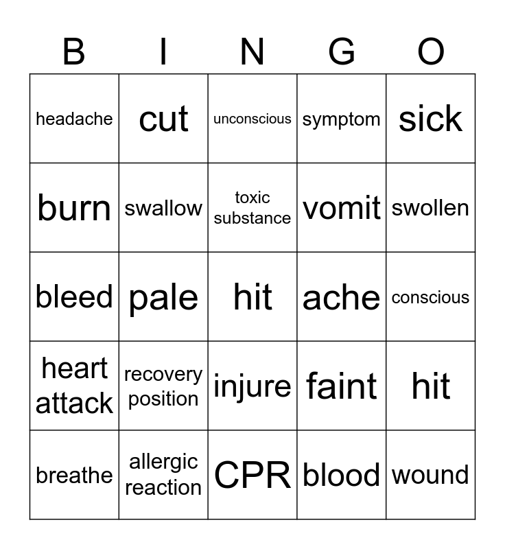 This bingo card has a free space and 24 words: recovery position, allergic reaction, toxic substance, breathe, sick, headache, burn, cut, ache, injure, vomit, bleed, faint, hit, swallow, blood, conscious, unconscious, swollen, pale, wound, heart attack, symptom and CPR.