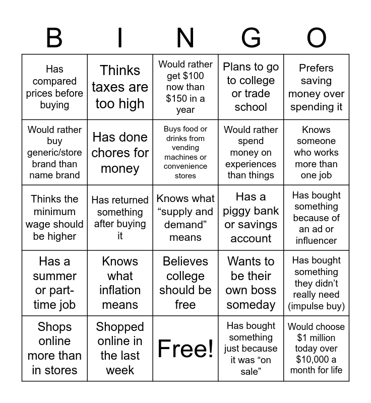 This bingo card has 25 words: Has a summer or part-time job, Shopped online in the last week, Knows what “supply and demand” means, Has bought something just because it was “on sale”, Prefers saving money over spending it, Has compared prices before buying, Thinks taxes are too high, Would rather get $100 now than $150 in a year, Has a piggy bank or savings account, Has bought something they didn’t really need (impulse buy), Would rather buy generic/store brand than name brand, Has done chores for money, Free!, Wants to be their own boss someday, Knows someone who works more than one job, Shops online more than in stores, Has returned something after buying it, Buys food or drinks from vending machines or convenience stores, Would rather spend money on experiences than things, Has bought something because of an ad or influencer, Thinks the minimum wage should be higher, Knows what inflation means, Believes college should be free, Plans to go to college or trade school and Would choose $1 million today over $10,000 a month for life.