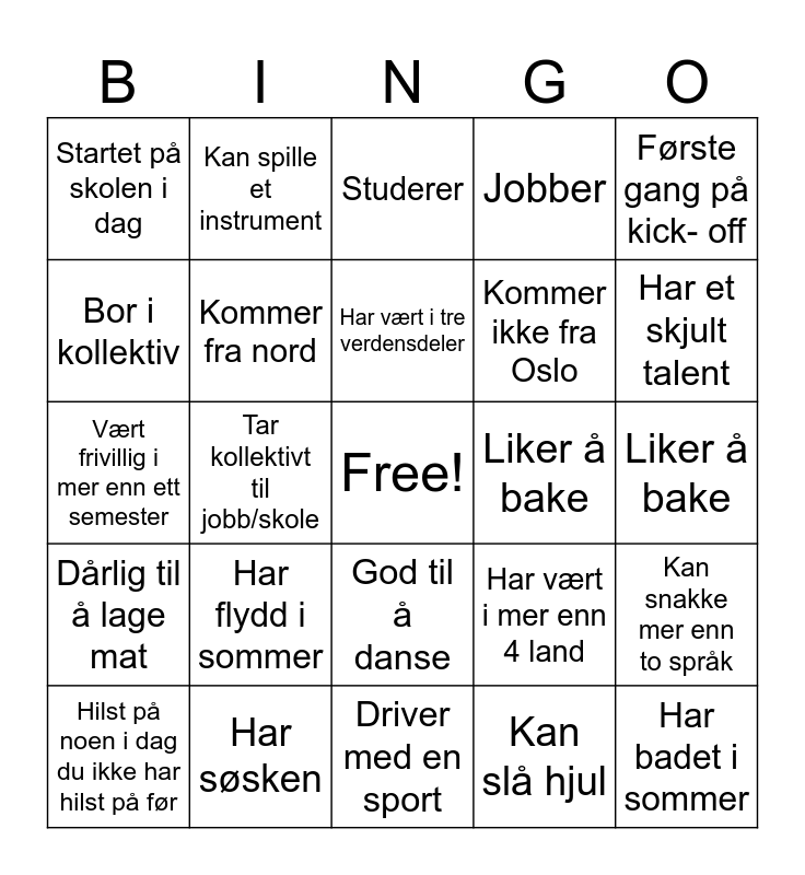This bingo card has a free space and 24 words: Har flydd i sommer, Har søsken, Har vært i tre verdensdeler, Hilst på noen i dag du ikke har hilst på før, Første gang på kick- off, Startet på skolen i dag, Bor i kollektiv, Kan spille et instrument, Liker å bake, God til å danse, Kommer ikke fra Oslo, Vært frivillig i mer enn ett semester, Har vært i mer enn 4 land, Kan snakke mer enn to språk, Kommer fra nord, Kan slå hjul, Liker å bake, Studerer, Har et skjult talent, Tar kollektivt til jobb/skole, Har badet i sommer, Dårlig til å lage mat, Jobber and Driver med en sport.