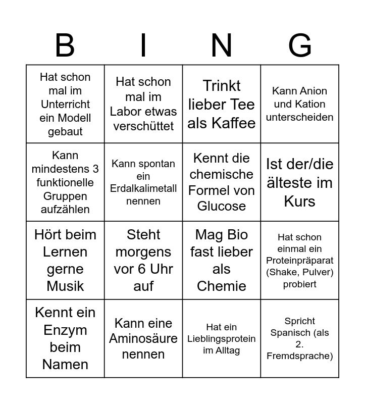This bingo card has 16 words: Kann eine Aminosäure nennen, Hat schon einmal ein Proteinpräparat (Shake, Pulver) probiert, Trinkt lieber Tee als Kaffee, Hat schon mal im Unterricht ein Modell gebaut, Hört beim Lernen gerne Musik, Hat schon mal im Labor etwas verschüttet, Mag Bio fast lieber als Chemie, Hat ein Lieblingsprotein im Alltag, Kann mindestens 3 funktionelle Gruppen aufzählen, Kann spontan ein Erdalkalimetall nennen, Kennt ein Enzym beim Namen, Kann Anion und Kation unterscheiden, Steht morgens vor 6 Uhr auf, Ist der/die älteste im Kurs, Kennt die chemische Formel von Glucose and Spricht Spanisch (als 2. Fremdsprache).
