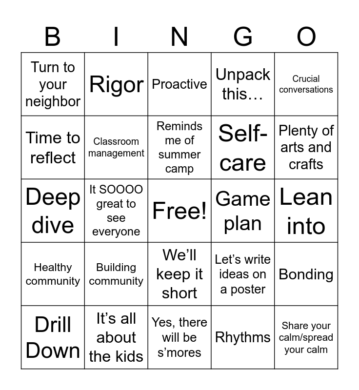 This bingo card has a free space and 32 words: Rhythms, Our students, It SOOOO great to see everyone, Team building(said or done), Healthy community, Classroom management, Crucial conversations, Bonding, Rigor, Fidelity, Reminds me of summer camp, Proactive, Circle back, It’s on my radar, Game plan, Lots of moving parts, Drill Down, Deep dive, We’ll keep it short, Building community, Let’s write ideas on a poster, Let’s break into small groups for reflection/discussion, Lean into, It’s all about the kids, Share your calm/spread your calm, Unpack this…, Self-care, Time to reflect, Turn to your neighbor, Yes, there will be s’mores, There will be plenty of free time to relax and Plenty of arts and crafts.