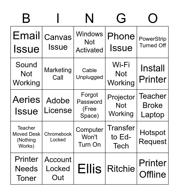 This bingo card has a free space and 24 words: Chromebook Locked, Account Locked Out, Cable Unplugged, Printer Needs Toner, PowerStrip Turned Off, Email Issue, Sound Not Working, Canvas Issue, Projector Not Working, Computer Won't Turn On, Wi-Fi Not Working, Aeries Issue, Transfer to Ed-Tech, Hotspot Request, Marketing Call, Ritchie, Teacher Broke Laptop, Windows Not Activated, Install Printer, Adobe License, Printer Offline, Teacher Moved Desk (Nothing Works), Phone Issue and Ellis.