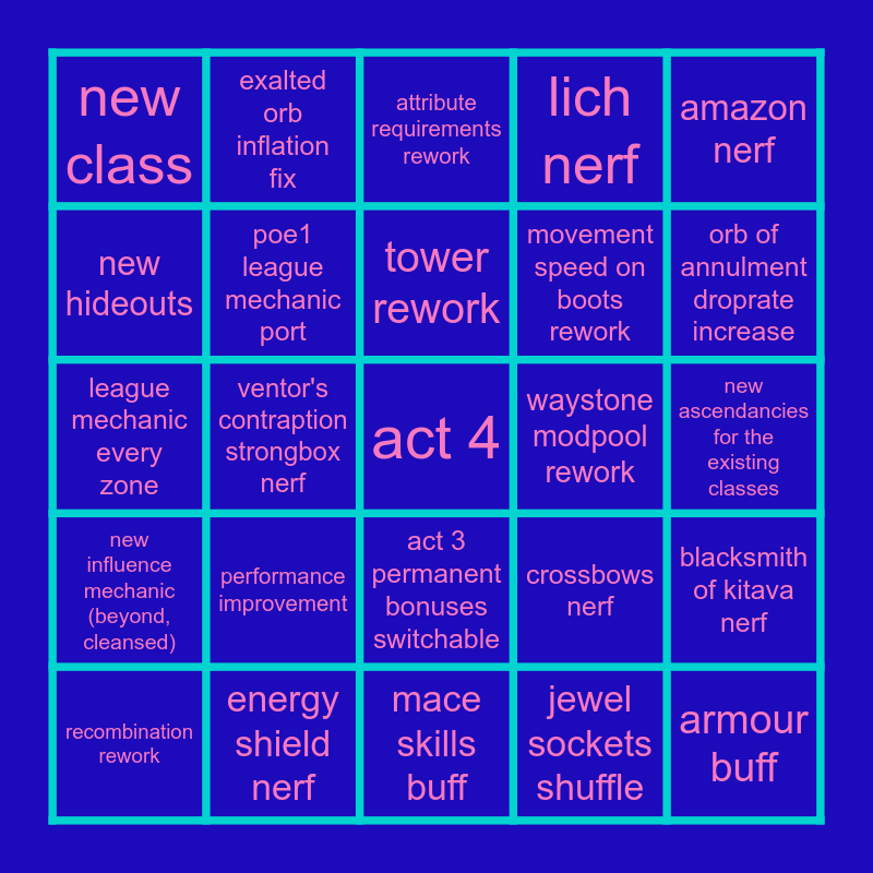 This bingo card has a free space and 24 words: performance improvement, energy shield nerf, tower rework, recombination rework, amazon nerf, new class, new hideouts, exalted orb inflation fix, waystone modpool rework, act 3 permanent bonuses switchable, movement speed on boots rework, league mechanic every zone, crossbows nerf, blacksmith of kitava nerf, poe1 league mechanic port, jewel sockets shuffle, new ascendancies for the existing classes, attribute requirements rework, orb of annulment droprate increase, ventor's contraption strongbox nerf, armour buff, new influence mechanic (beyond, cleansed), lich nerf and mace skills buff.