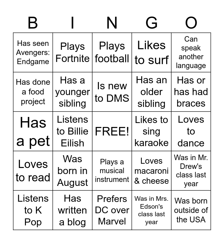 This bingo card has a free space and 32 words: Was in Mrs. Edson's class last year, Born in September, Listens to Billie Eilish, Was born in February, Loves to read, Has a younger sibling, Can speak another language, Was in Mr. Drew's class last year, Plays Fortnite, Has ridden a horse, Is new to DMS, Plays football, Loves to play video games, Has made a YouTube video, Likes to sing karaoke, Traveled to another country this summer, Listens to K Pop, Has a pet, Plays a musical instrument, Was born in August, Loves macaroni & cheese, Is an only child, Loves to dance, Has written a blog, Was born outside of the USA, Likes to surf, Has an older sibling, Has done a food project, Has seen Avengers: Endgame, Prefers DC over Marvel, Prefers Marvel over DC and Has or has had braces.