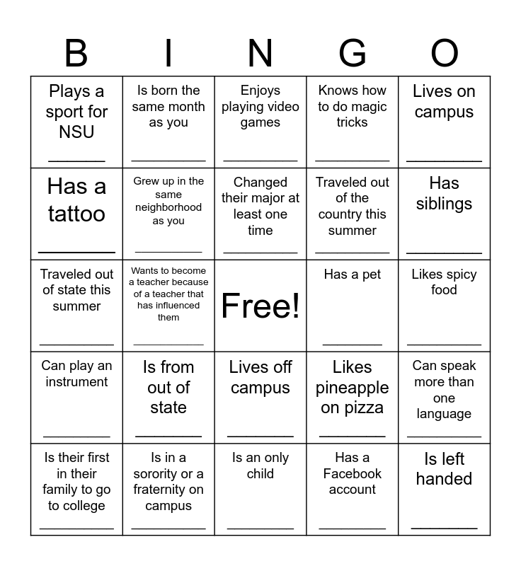 This bingo card has a free space and 24 words: Is from out of state _______, Is in a sorority or a fraternity on campus __________, Changed their major at least one time __________, Is their first in their family to go to college __________, Lives on campus ________, Plays a sport for NSU ______, Has a tattoo ______, Is born the same month as you __________, Has a pet ________, Lives off campus _______, Traveled out of the country this summer __________, Traveled out of state this summer __________, Likes pineapple on pizza _______, Can speak more than one language __________, Grew up in the same neighborhood as you ___________, Has a Facebook account _________, Likes spicy food __________, Enjoys playing video games __________, Has siblings ________, Wants to become a teacher because of a teacher that has influenced them _____________, Is left handed _______, Can play an instrument _________, Knows how to do magic tricks __________ and Is an only child _________.