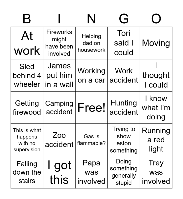 This bingo card has a free space and 24 words: Zoo accident, I got this, Working on a car, Falling down the stairs, Moving, At work, Sled behind 4 wheeler, Fireworks might have been involved, Hunting accident, Gas is flammable?, Work accident, Getting firewood, Trying to show eston something, Running a red light, James put him in a wall, Doing something generally stupid, I know what I’m doing, Helping dad on housework, I thought I could, Camping accident, Trey was involved, This is what happens with no supervision, Tori said I could and Papa was involved.
