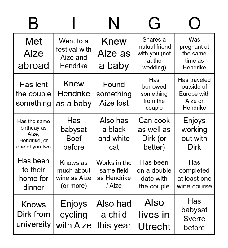 This bingo card has 29 words: Knows Dirk from university, Went to the same elementary school as Aize, Has babysat Boef before, Has babysat Sverre before, Met Aize abroad, Knew Aize as a baby, Knew Hendrike as a baby, Knows as much about wine as Aize (or more), Can cook as well as Dirk (or better), Enjoys cycling with Aize, Enjoys working out with Dirk, Also has a black and white cat, Also had a child this year, Also lives in Utrecht, Has traveled outside of Europe with Aize or Hendrike, Attended the same high school as Hendrike / Aize, Works in the same field as Hendrike / Aize, Has been to their home for dinner, Was pregnant at the same time as Hendrike, Has the same birthday as Aize, Hendrike, or one of you two, Has been on a double date with the couple, Helped Aize or Hendrike move house, Has borrowed something from the couple, Has lent the couple something, Shares a mutual friend with you (not at the wedding), Went to a festival with Aize and Hendrike, Has completed at least one wine course, Found something Aize lost and Spent a night at "the island".