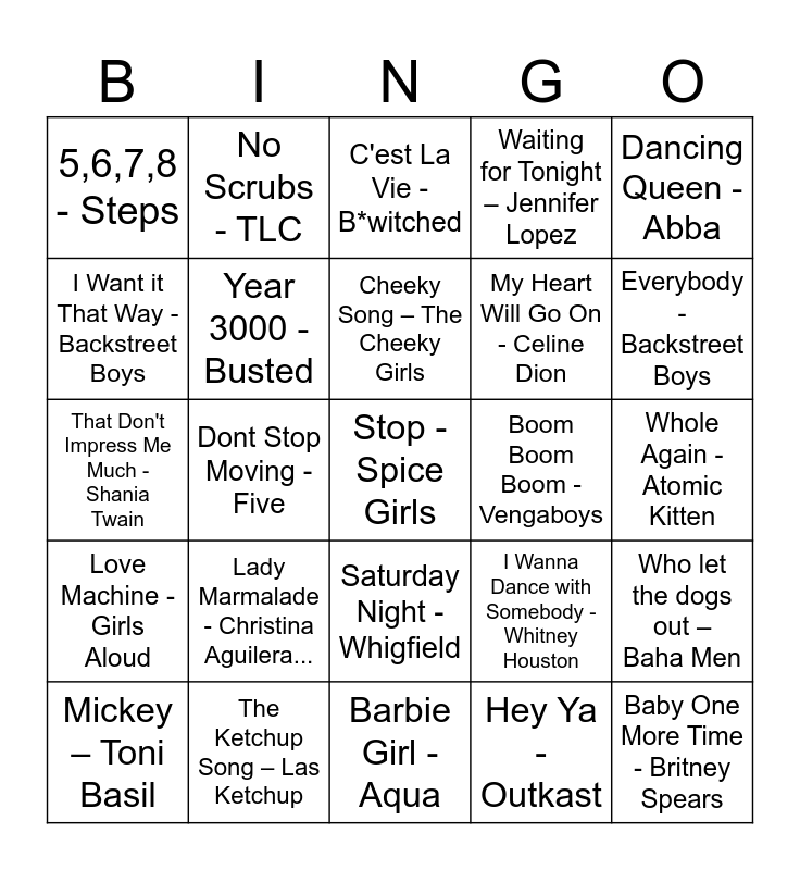 This bingo card has 30 words: The Ketchup Song – Las Ketchup, Reach - S Club 7, Dont Stop Moving - Five, Mysterious Girl - Peter Andre, 5,6,7,8 - Steps, C'est La Vie - B*witched, Year 3000 - Busted, Saturday Night - Whigfield, Boom Boom Boom - Vengaboys, Barbie Girl - Aqua, Whole Again - Atomic Kitten, Stop - Spice Girls, Hey Ya - Outkast, Baby One More Time - Britney Spears, Everybody - Backstreet Boys, Genie in a Bottle - Christina Aguilera, I Wanna Dance with Somebody - Whitney Houston, Love Machine - Girls Aloud, Lady Marmalade - Christina Aguilera..., Dancing Queen - Abba, That Don't Impress Me Much - Shania Twain, Believe - Cher, No Scrubs - TLC, My Heart Will Go On - Celine Dion, I Want it That Way - Backstreet Boys, Waiting for Tonight – Jennifer Lopez, Who let the dogs out – Baha Men, Mickey – Toni Basil, Cheeky Song – The Cheeky Girls and Macarena – Los Del Rio.
