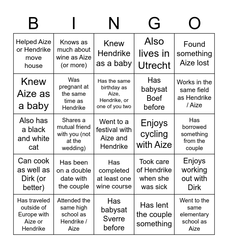 This bingo card has 27 words: Took care of Hendrike when she was sick, Went to the same elementary school as Aize, Has babysat Boef before, Has babysat Sverre before, Knew Aize as a baby, Knew Hendrike as a baby, Knows as much about wine as Aize (or more), Can cook as well as Dirk (or better), Enjoys cycling with Aize, Enjoys working out with Dirk, Also has a black and white cat, Also lives in Utrecht, Has traveled outside of Europe with Aize or Hendrike, Attended the same high school as Hendrike / Aize, Works in the same field as Hendrike / Aize, Has been to their home for dinner, Was pregnant at the same time as Hendrike, Has the same birthday as Aize, Hendrike, or one of you two, Has been on a double date with the couple, Helped Aize or Hendrike move house, Has borrowed something from the couple, Has lent the couple something, Shares a mutual friend with you (not at the wedding), Went to a festival with Aize and Hendrike, Has completed at least one wine course, Found something Aize lost and Spent a night at "the island".