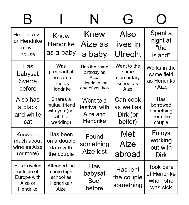 This bingo card has 27 words: Met Aize abroad, Took care of Hendrike when she was sick, Went to the same elementary school as Aize, Has babysat Boef before, Has babysat Sverre before, Knew Aize as a baby, Knew Hendrike as a baby, Knows as much about wine as Aize (or more), Can cook as well as Dirk (or better), Enjoys working out with Dirk, Also has a black and white cat, Also lives in Utrecht, Has traveled outside of Europe with Aize or Hendrike, Attended the same high school as Hendrike / Aize, Works in the same field as Hendrike / Aize, Has been to their home for dinner, Was pregnant at the same time as Hendrike, Has the same birthday as Aize, Hendrike, or one of you two, Has been on a double date with the couple, Helped Aize or Hendrike move house, Has borrowed something from the couple, Has lent the couple something, Shares a mutual friend with you (not at the wedding), Went to a festival with Aize and Hendrike, Found something Aize lost, Spent a night at "the island" and Enjoys cycling with Aize.