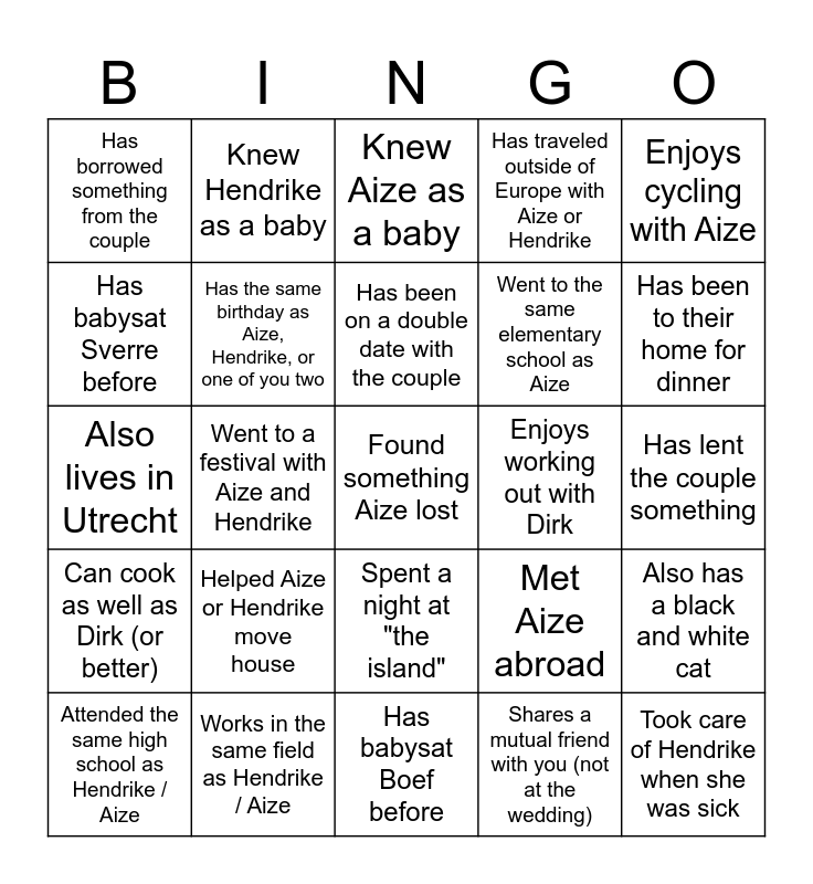This bingo card has 27 words: Met Aize abroad, Took care of Hendrike when she was sick, Went to the same elementary school as Aize, Has babysat Boef before, Has babysat Sverre before, Knew Aize as a baby, Knew Hendrike as a baby, Can cook as well as Dirk (or better), Enjoys working out with Dirk, Also has a black and white cat, Also lives in Utrecht, Has traveled outside of Europe with Aize or Hendrike, Attended the same high school as Hendrike / Aize, Works in the same field as Hendrike / Aize, Has been to their home for dinner, Was pregnant at the same time as Hendrike, Has the same birthday as Aize, Hendrike, or one of you two, Has been on a double date with the couple, Helped Aize or Hendrike move house, Has borrowed something from the couple, Has lent the couple something, Shares a mutual friend with you (not at the wedding), Went to a festival with Aize and Hendrike, Found something Aize lost, Spent a night at "the island", Enjoys cycling with Aize and Has completed at least one wine course.