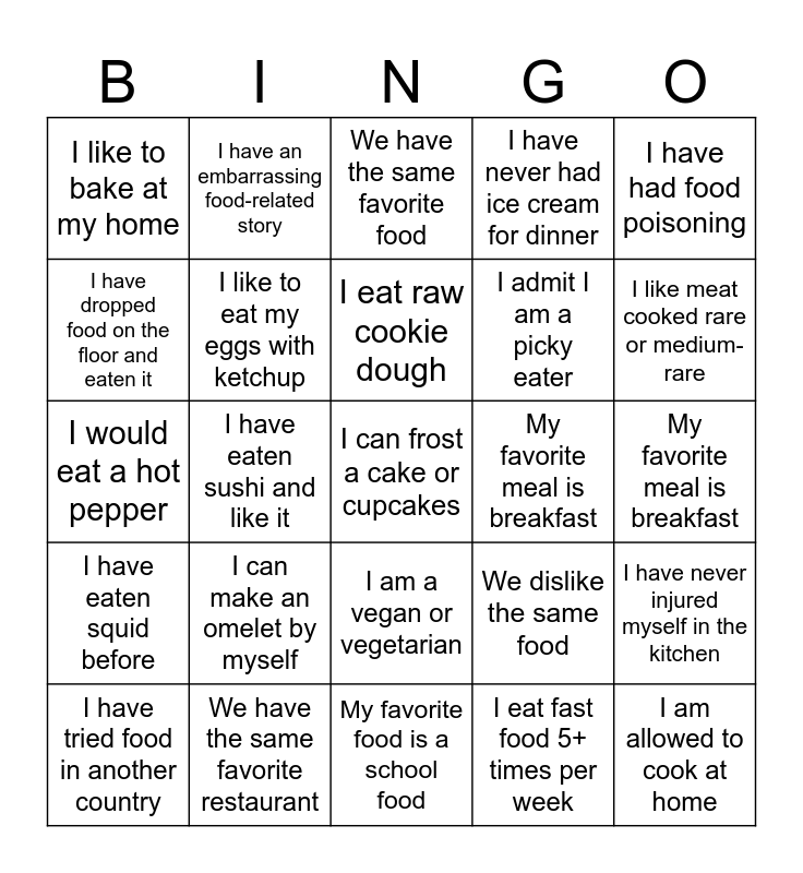 This bingo card has a free space and 29 words: I have tried food in another country, I know how to fry chicken, I have eaten sushi and like it, I can identify a colander, I like to bake at my home, We have the same favorite food, I like to eat my eggs with ketchup, I can make an omelet by myself, My favorite meal is breakfast, We have the same favorite restaurant, My favorite meal is breakfast, I am allowed to cook at home, My favorite food is a school food, I eat fast food 5+ times per week, I like meat cooked rare or medium-rare, I have eaten an entire bag of chips in one sitting, I am a vegan or vegetarian, I have eaten squid before, I have had food poisoning, I would eat a hot pepper, We dislike the same food, I can identify a rubber scraper, I admit I am a picky eater, I have dropped food on the floor and eaten it, I have never had ice cream for dinner, I have an embarrassing food-related story, I have never injured myself in the kitchen, I eat raw cookie dough and I can define "fusion cuisine".