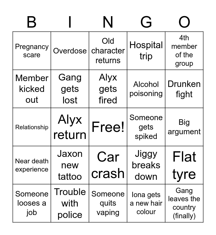This bingo card has a free space and 24 words: Someone looses a job, Jaxon new tattoo, Alyx gets fired, Iona gets a new hair colour, 4th member of the group, Pregnancy scare, Overdose, Old character returns, Someone gets spiked, Big argument, Relationship, Gang gets lost, Jiggy breaks down, Flat tyre, Member kicked out, Trouble with police, Someone quits vaping, Hospital trip, Drunken fight, Near death experience, Alyx return, Car crash, Alcohol poisoning and Gang leaves the country (finally).