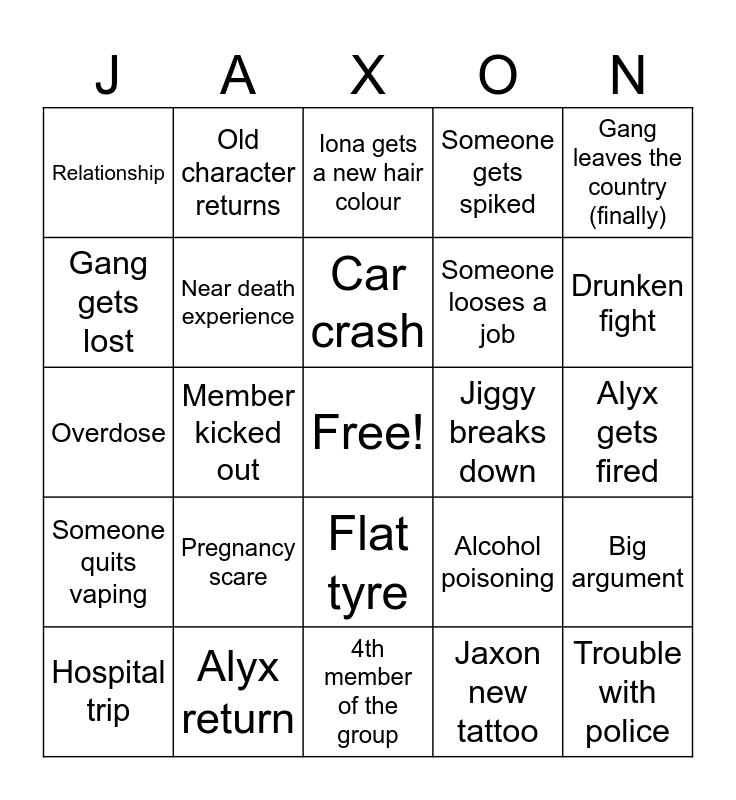 This bingo card has a free space and 24 words: Pregnancy scare, Alyx return, Car crash, Hospital trip, Gang leaves the country (finally), Relationship, Gang gets lost, Old character returns, Jiggy breaks down, Flat tyre, Someone looses a job, Overdose, Alcohol poisoning, Big argument, Near death experience, Jaxon new tattoo, Alyx gets fired, Iona gets a new hair colour, Drunken fight, Member kicked out, Trouble with police, Someone quits vaping, Someone gets spiked and 4th member of the group.