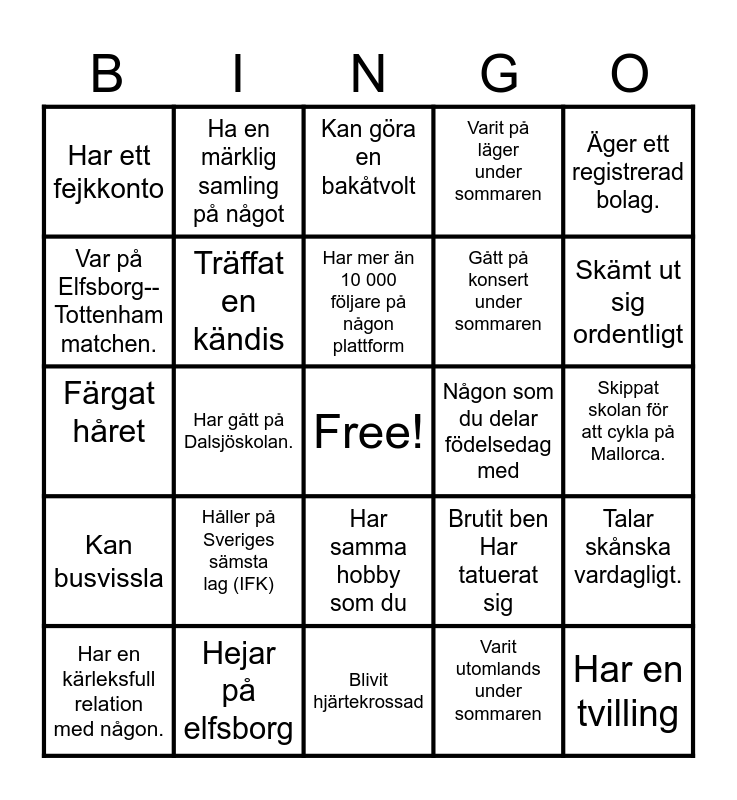 This bingo card has a free space and 24 words: Håller på Sveriges sämsta lag (IFK), Hejar på elfsborg, Har mer än 10 000 följare på någon plattform, Har en kärleksfull relation med någon., Äger ett registrerad bolag., Har ett fejkkonto, Var på Elfsborg--Tottenham matchen., Ha en märklig samling på något, Någon som du delar födelsedag med, Har samma hobby som du, Gått på konsert under sommaren, Färgat håret, Brutit ben Har tatuerat sig, Talar skånska vardagligt., Träffat en kändis, Varit utomlands under sommaren, Skippat skolan för att cykla på Mallorca., Kan göra en bakåtvolt, Skämt ut sig ordentligt, Har gått på Dalsjöskolan., Har en tvilling, Kan busvissla, Varit på läger under sommaren and Blivit hjärtekrossad.