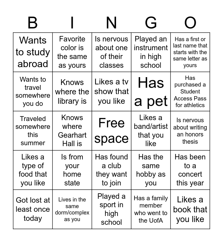 This bingo card has a free space and 24 words: Is from your home state, Lives in the same dorm/complex as you, Likes a tv show that you like, Got lost at least once today, Has a first or last name that starts with the same letter as yours, Wants to study abroad, Wants to travel somewhere you do, Favorite color is the same as yours, Likes a band/artist that you like, Has found a club they want to join, Has a pet, Traveled somewhere this summer, Has the same hobby as you, Has been to a concert this year, Knows where the library is, Has a family member who went to the UofA, Is nervous about writing an honors thesis, Is nervous about one of their classes, Has purchased a Student Access Pass for athletics, Knows where Gearhart Hall is, Likes a book that you like, Likes a type of food that you like, Played an instrument in high school and Played a sport in high school.