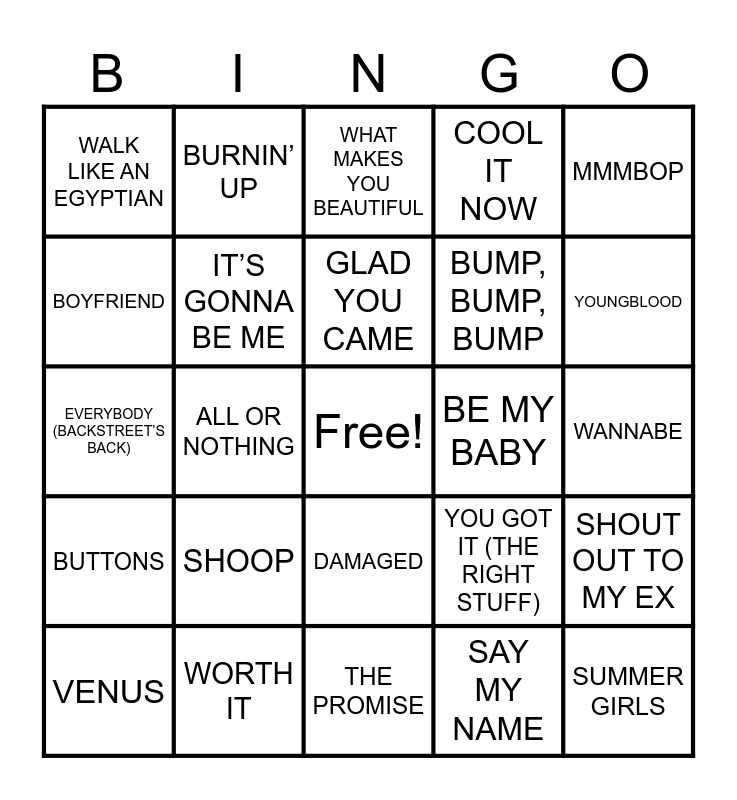 This bingo card has a free space and 75 words: I WANT IT THAT WAY, BYE BYE BYE, WHAT MAKES YOU BEAUTIFUL, SUCKER, STEP BY STEP, GIVE ME JUST ONE NIGHT (UNA NOCHE), MOTOWNPHILLY, DYNAMITE, ABC, BACK FOR GOOD, UPTOWN GIRL, ALL RISE, GLAD YOU CAME, BOYFRIEND, SHE LOOKS SO PERFECT, ALL OR NOTHING, BACK HERE, SUMMER GIRLS, CANDY GIRL, MMMBOP, LIVE WHILE WE’RE YOUNG, EVERYBODY (BACKSTREET’S BACK), IT’S GONNA BE ME, BURNIN’ UP, COOL IT NOW, I’M A BELIEVER, BECAUSE OF YOU, WINDOWS DOWN, CHASING THE SUN, BOY WITH LUV, MRS. RIGHT, BEAT AGAIN, NO MATTER WHAT, YOU GOT IT (THE RIGHT STUFF), YOUNGBLOOD, BUMP, BUMP, BUMP, END OF THE ROAD, YEAR 3000, WANNABE, SAY MY NAME, NO SCRUBS, WORK FROM HOME, BLACK MAGIC, DON’T CHA, SOUND OF THE UNDERGROUND, DON’T LET GO (LOVE), VENUS, WALK LIKE AN EGYPTIAN, YOU CAN’T HURRY LOVE, WEAK, NO MORE (BABY I’MA DO RIGHT), DAMAGED, NEVER EVER, WHOLE AGAIN, PUSH THE BUTTON, HIGHER, ALL THE THINGS SHE SAID, HOLD ON, WE GOT THE BEAT, I’M SO EXCITED, SHOOP, JUST KICKIN’ IT, WHERE MY GIRLS AT?, KILL THIS LOVE, I AM THE BEST, BE MY BABY, BOOTYLICIOUS, WATERFALLS, SPICE UP YOUR LIFE, SHOUT OUT TO MY EX, BUTTONS, WORTH IT, FREE YOUR MIND, THE PROMISE and ABOUT YOU NOW.