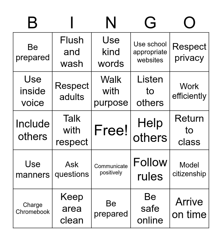 This bingo card has a free space and 24 words: Ask questions, Keep area clean, Walk with purpose, Charge Chromebook, Respect privacy, Be prepared, Use inside voice, Flush and wash, Help others, Communicate positively, Listen to others, Include others, Follow rules, Model citizenship, Respect adults, Be safe online, Return to class, Use kind words, Work efficiently, Talk with respect, Arrive on time, Use manners, Use school appropriate websites and Be prepared.