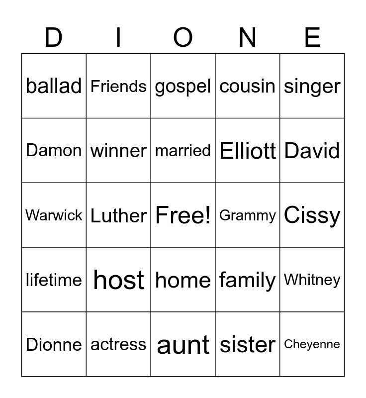 This bingo card has a free space and 24 words: host, actress, married, Dionne, singer, ballad, Damon, Friends, Grammy, home, Elliott, Warwick, family, Whitney, winner, sister, Cissy, gospel, David, Luther, Cheyenne, lifetime, cousin and aunt.