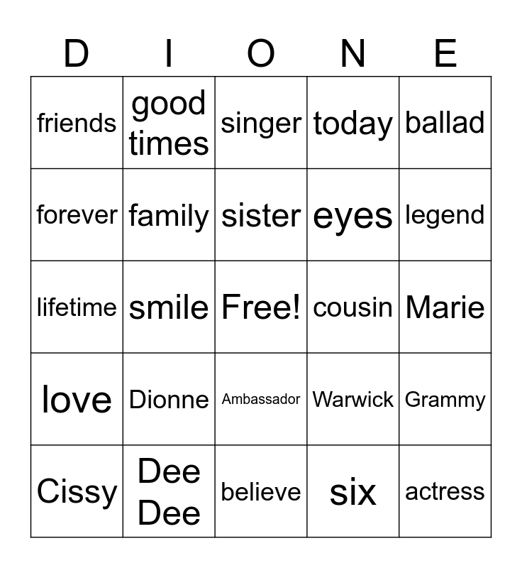 This bingo card has a free space and 24 words: Dionne, Dee Dee, sister, Cissy, ballad, friends, forever, good times, cousin, Ambassador, eyes, lifetime, Warwick, Grammy, family, six, Marie, singer, legend, smile, actress, love, today and believe.