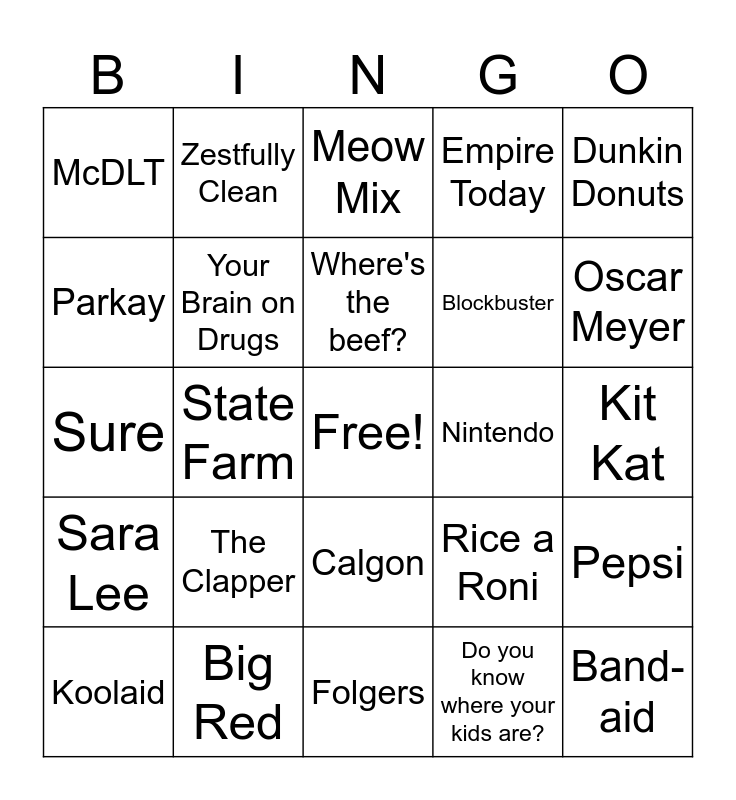 This bingo card has a free space and 24 words: The Clapper, Big Red, Where's the beef?, Koolaid, Dunkin Donuts, McDLT, Parkay, Zestfully Clean, Nintendo, Calgon, Blockbuster, Sure, Rice a Roni, Pepsi, Your Brain on Drugs, Do you know where your kids are?, Kit Kat, Meow Mix, Oscar Meyer, State Farm, Band-aid, Sara Lee, Empire Today and Folgers.