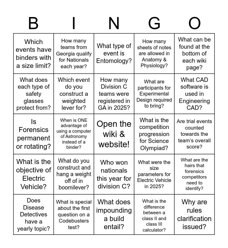 This bingo card has a free space and 26 words: Who won nationals this year for division C?, What is the difference between a class II and class III calculator?, How many Division C teams were registered in GA in 2025?, What is special about the first question on a Codebusters test?, What can be found at the bottom of each wiki page?, Which events have binders with a size limit?, What does each type of safety glasses protect from?, How many teams from Georgia qualify for Nationals each year?, Are trial events counted towards the team’s overall score?, What were the size parameters for Electric Vehicle in 2025?, What are participants for Experimental Design required to bring?, Is Forensics permanent or rotating?, What are the hairs that forensics competitors need to identify?, Does Disease Detectives have a yearly topic?, When is ONE advantage of using a computer of Astronomy instead of a binder?, What safety equipment must be worn during Chem Lab?, How many sheets of notes are allowed in Anatomy & Physiology?, What is the objective of Electric Vehicle?, What type of event is Entomology?, Why are rules clarification issued?, What CAD software is used in Engineering CAD?, What does impounding a build entail?, What is the competition progression for Science Olympiad?, What do you construct and hang a weight off of in boomilever?, Which event do you construct a weighted lever for? and Can a cheat sheet/one pager have notes on one or both sides of the paper?.