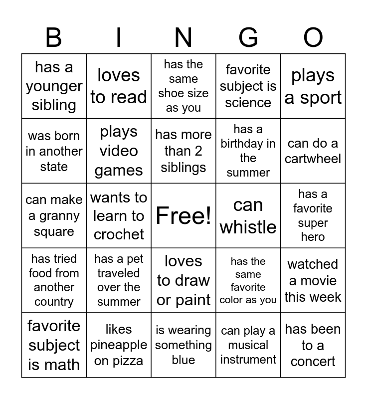 This bingo card has a free space and 25 words: has a pet traveled over the summer, is wearing something blue, has more than 2 siblings, favorite subject is math, plays a sport, has a younger sibling, was born in another state, loves to read, can whistle, loves to draw or paint, has a birthday in the summer, can make a granny square, has the same favorite color as you, watched a movie this week, plays video games, doesn't like chocolate, has a favorite super hero, has the same shoe size as you, can do a cartwheel, wants to learn to crochet, has been to a concert, likes pineapple on pizza, has tried food from another country, favorite subject is science and can play a musical instrument.