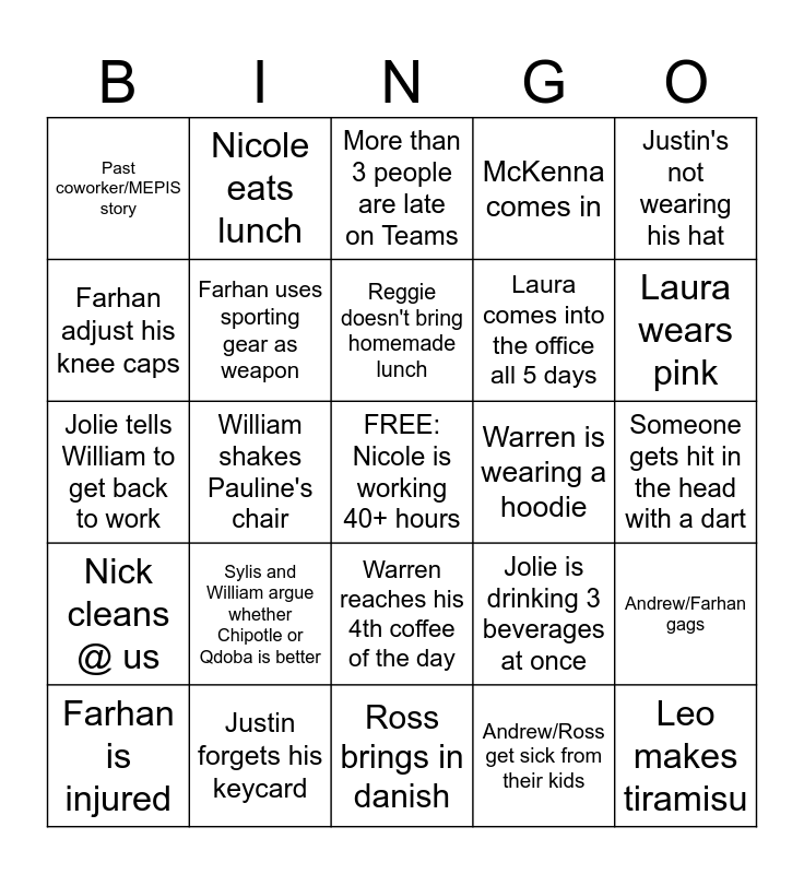 This bingo card has a free space and 44 words: Sylis goes to an Electrical event, Leo makes tiramisu, Warren & Nick go to tennis together, Farhan is injured, Farhan is on the floor, Andrew/Ross get sick from their kids, More than 3 people are late on Teams, Nick is working from somewhere random, Justin's not wearing his hat, Justin forgets his keycard, McKenna comes in, Warren is wearing a hoodie, Warren reaches his 4th coffee of the day, Sylis and William argue whether Chipotle or Qdoba is better, Andrew says "Cheer up Jolie", Ross brings in danish, Aravindh plays with his stress ball, Jolie tells William to get back to work, Farhan says something mean to Leo, Laura wears pink, Nicole eats lunch, Nicole messages someone on Teams on her day off, New office rock, Past coworker/MEPIS story, Pink pig falls on its own, Someone gets hit in the head with a dart, Farhan does the Indian uncle accent, Andrew says jesus christ farhan, Jolie is drinking 3 beverages at once, Nick cleans @ us, Laura says Hi friends!, Andrew/Farhan gags, Warren is waiting for a package, Kristen visits, William shakes Pauline's chair, Mike works from home, Mike leaves past 3, Farhan takes shoes off, Reggie doesn't bring homemade lunch, Farhan adjust his knee caps, Laura comes into the office all 5 days, Nick brings in sporting gear (and it could be used as a weapon), Farhan uses sporting gear as weapon and Allison takes a shot.