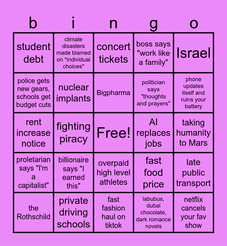 This bingo card has a free space and 24 words: billionaire says "I earned this", private driving schools, Bigpharma, the Rothschild, Israel, student debt, police gets new gears, schools get budget cuts, climate disasters made blamed on "individual choices", AI replaces jobs, overpaid high level athletes, politician says "thoughts and prayers", rent increase notice, fast food price, late public transport, nuclear implants, labubus, dubai chocolate, dark romance novels, taking humanity to Mars, concert tickets, phone updates itself and ruins your battery, fighting piracy, netflix cancels your fav show, proletarian says "I'm a capitalist", boss says "work like a family" and fast fashion haul on tiktok.