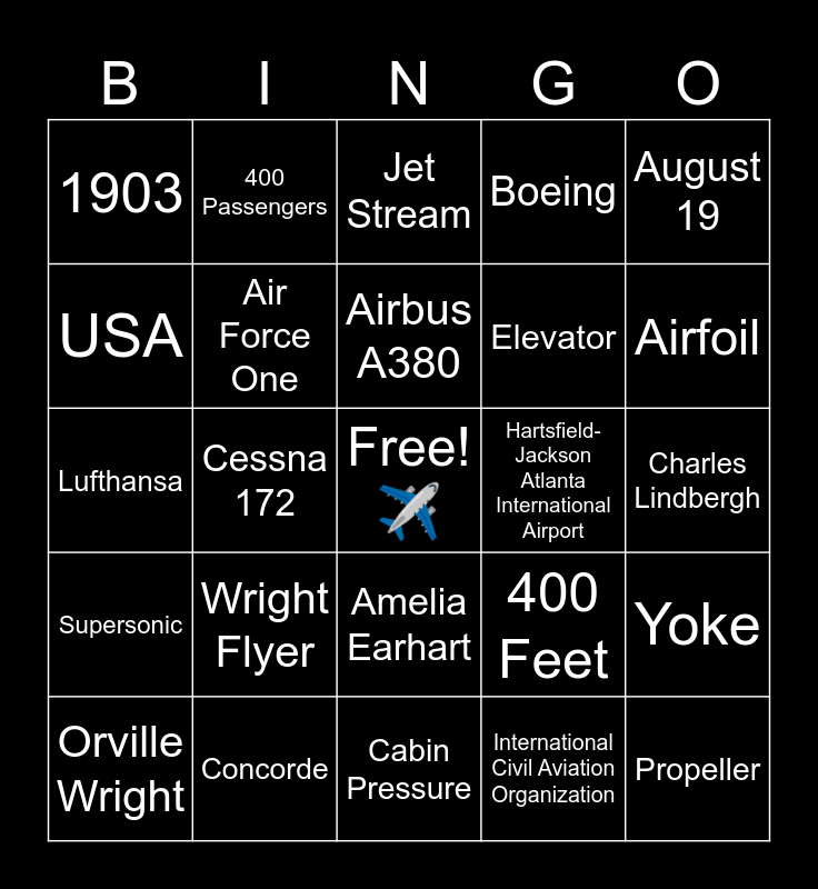 This bingo card has a free space and 24 words: Wright Flyer, Concorde, Airbus A380, Orville Wright, August 19, 1903, USA, 400 Passengers, Hartsfield-Jackson Atlanta International Airport, Amelia Earhart, Elevator, Lufthansa, 400 Feet, Yoke, Air Force One, International Civil Aviation Organization, Charles Lindbergh, Jet Stream, Airfoil, Cessna 172, Propeller, Supersonic, Boeing and Cabin Pressure.