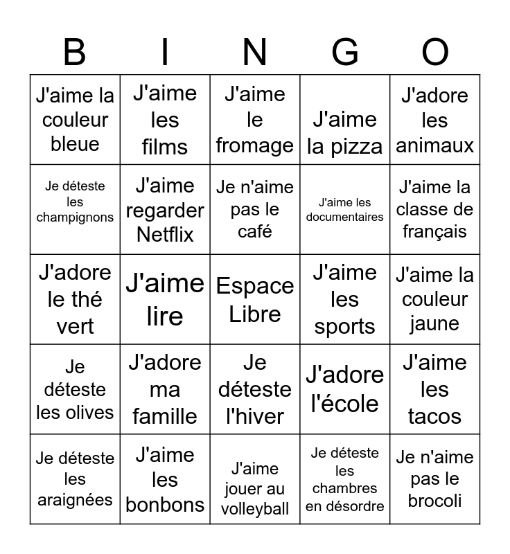 This bingo card has a free space and 24 words: J'adore ma famille, J'aime les bonbons, Je n'aime pas le café, Je déteste les araignées, J'adore les animaux, J'aime la couleur bleue, Je déteste les champignons, J'aime les films, J'aime les sports, Je déteste l'hiver, J'aime les documentaires, J'adore le thé vert, J'adore l'école, J'aime les tacos, J'aime regarder Netflix, Je déteste les chambres en désordre, J'aime la couleur jaune, J'aime le fromage, J'aime la classe de français, J'aime lire, Je n'aime pas le brocoli, Je déteste les olives, J'aime la pizza and J'aime jouer au volleyball.