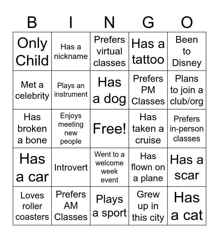 This bingo card has a free space and 24 words: Introvert, Prefers AM Classes, Has a dog, Loves roller coasters, Been to Disney, Only Child, Met a celebrity, Has a nickname, Has taken a cruise, Went to a welcome week event, Prefers PM Classes, Has broken a bone, Has flown on a plane, Has a scar, Plays an instrument, Grew up in this city, Prefers in-person classes, Prefers virtual classes, Plans to join a club/org, Enjoys meeting new people, Has a cat, Has a car, Has a tattoo and Plays a sport.