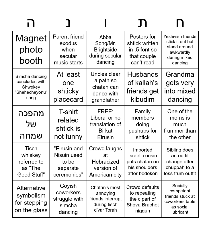 This bingo card has a free space and 24 words: "Eirusin and Nisuin used to be separate ceremonies", Goyish coworkers struggle with simcha dancing, Uncles clear a path so chatan can dance with grandfather, Alternative symbolism for stepping on the glass, Yeshivish friends stick it out but stand around awkwardly during mixed dancing, Magnet photo booth, Simcha dancing concludes with Shwekey "Shehecheyonu" song, Parent friend exodus when secular music starts, Family members doing pushups for shtick, Crowd laughs at Hebracized version of American city, Husbands of kallah's friends get kibudim, מהפכה של שמחה, Imported Israeli cousin puts chatan on his shoulders after bedeken, Sibling does an outfit change after chuppah to a less frum outfit, At least one shticky placecard, Crowd defaults to repeating the c part of Sheva Brachot niggun, One of the moms is much frummer than the other, Abba Song/Mr. Brightside during secular dancing, Grandma gets very into mixed dancing, T-shirt related shtick is not funny, Socially competent friends stuck at coworkers table as social lubricant, Tisch whiskey referred to as "The Good Stuff", Posters for shtick written in .5 font so that couple can't read and Chatan's most annoying friends interrupt during tisch d'var Torah.