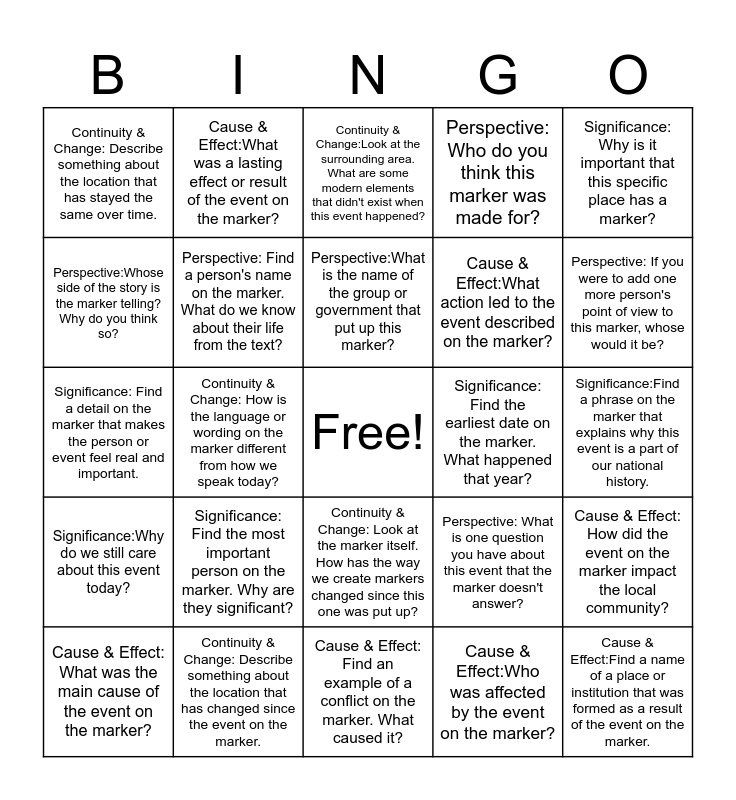 This bingo card has a free space and 24 words: Significance: Find the most important person on the marker. Why are they significant?, Continuity & Change: Describe something about the location that has changed since the event on the marker., Perspective:What is the name of the group or government that put up this marker?, Cause & Effect: What was the main cause of the event on the marker?, Significance: Why is it important that this specific place has a marker?, Continuity & Change: Describe something about the location that has stayed the same over time., Perspective:Whose side of the story is the marker telling? Why do you think so?, Cause & Effect:What was a lasting effect or result of the event on the marker?, Significance: Find the earliest date on the marker. What happened that year?, Continuity & Change: Look at the marker itself. How has the way we create markers changed since this one was put up?, Cause & Effect:What action led to the event described on the marker?, Significance: Find a detail on the marker that makes the person or event feel real and important., Perspective: What is one question you have about this event that the marker doesn't answer?, Cause & Effect: How did the event on the marker impact the local community?, Perspective: Find a person's name on the marker. What do we know about their life from the text?, Cause & Effect:Who was affected by the event on the marker?, Significance:Find a phrase on the marker that explains why this event is a part of our national history., Continuity & Change:Look at the surrounding area. What are some modern elements that didn't exist when this event happened?, Perspective: If you were to add one more person's point of view to this marker, whose would it be?, Continuity & Change: How is the language or wording on the marker different from how we speak today?, Cause & Effect:Find a name of a place or institution that was formed as a result of the event on the marker., Significance:Why do we still care about this event today?, Perspective: Who do you think this marker was made for? and Cause & Effect: Find an example of a conflict on the marker. What caused it?.