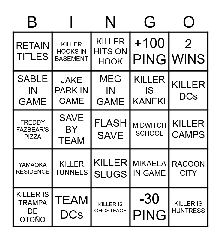 This bingo card has a free space and 24 words: KILLER TUNNELS, TEAM DCs, MEG IN GAME, KILLER IS TRAMPA DE OTOÑO, 2 WINS, RETAIN TITLES, SABLE IN GAME, KILLER HOOKS IN BASEMENT, MIDWITCH SCHOOL, KILLER SLUGS, KILLER IS KANEKI, FREDDY FAZBEAR'S PIZZA, MIKAELA IN GAME, RACOON CITY, JAKE PARK IN GAME, -30 PING, KILLER CAMPS, KILLER HITS ON HOOK, KILLER DCs, SAVE BY TEAM, KILLER IS HUNTRESS, YAMAOKA RESIDENCE, +100 PING and KILLER IS GHOSTFACE.